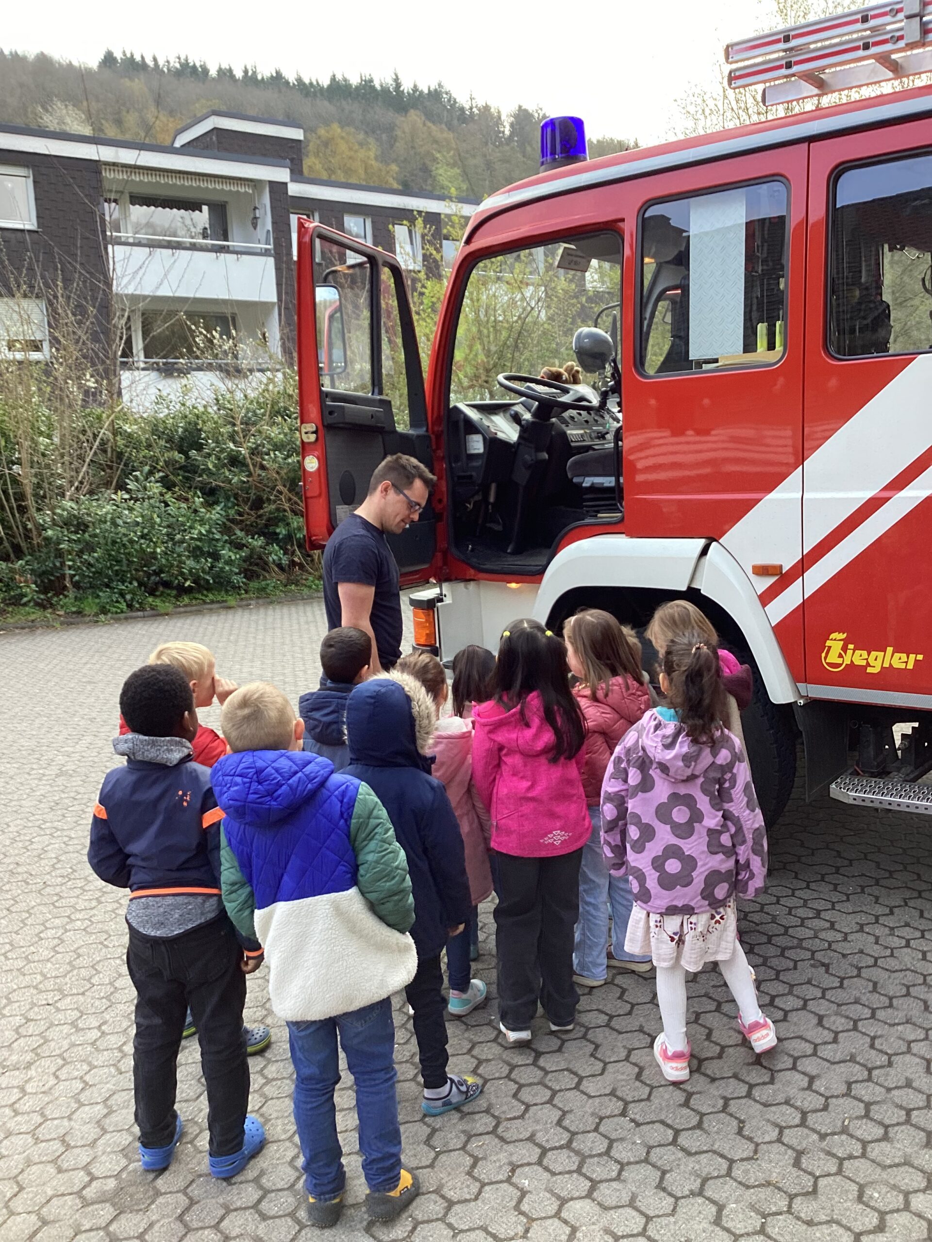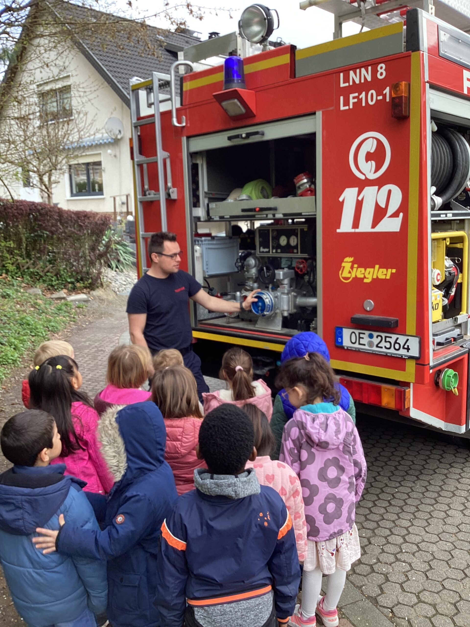Die Kinder der Einschulungsjahrgänge 2026 und 2027 haben gemeinsam mit ihm das richtige Verhalten geübt, wenn es brennt oder ein Unfall geschehen ist. Natürlich wurde auch das Feuerwehrauto ganz genau inspiziert.