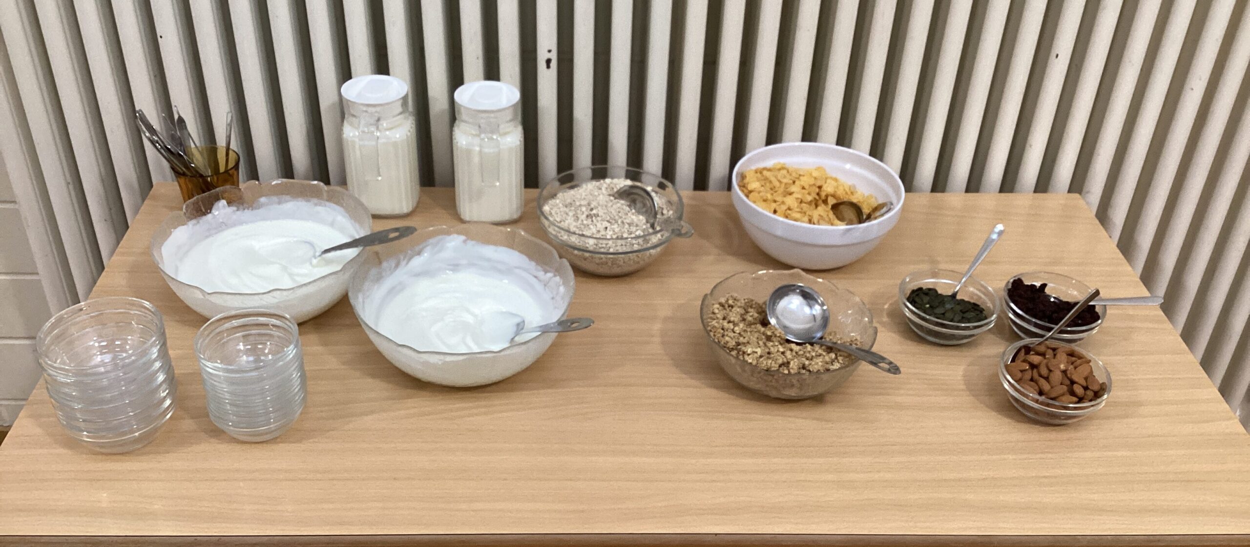 Die Kinder können sich, zusätzlich zu ihrem mitgebrachten Frühstück, je nach Geschmack und Belieben aus verschiedenen Körnern, Rosinen, Obst, Milch und Naturjoghurt ein gesundes Frühstück zusammenstellen.