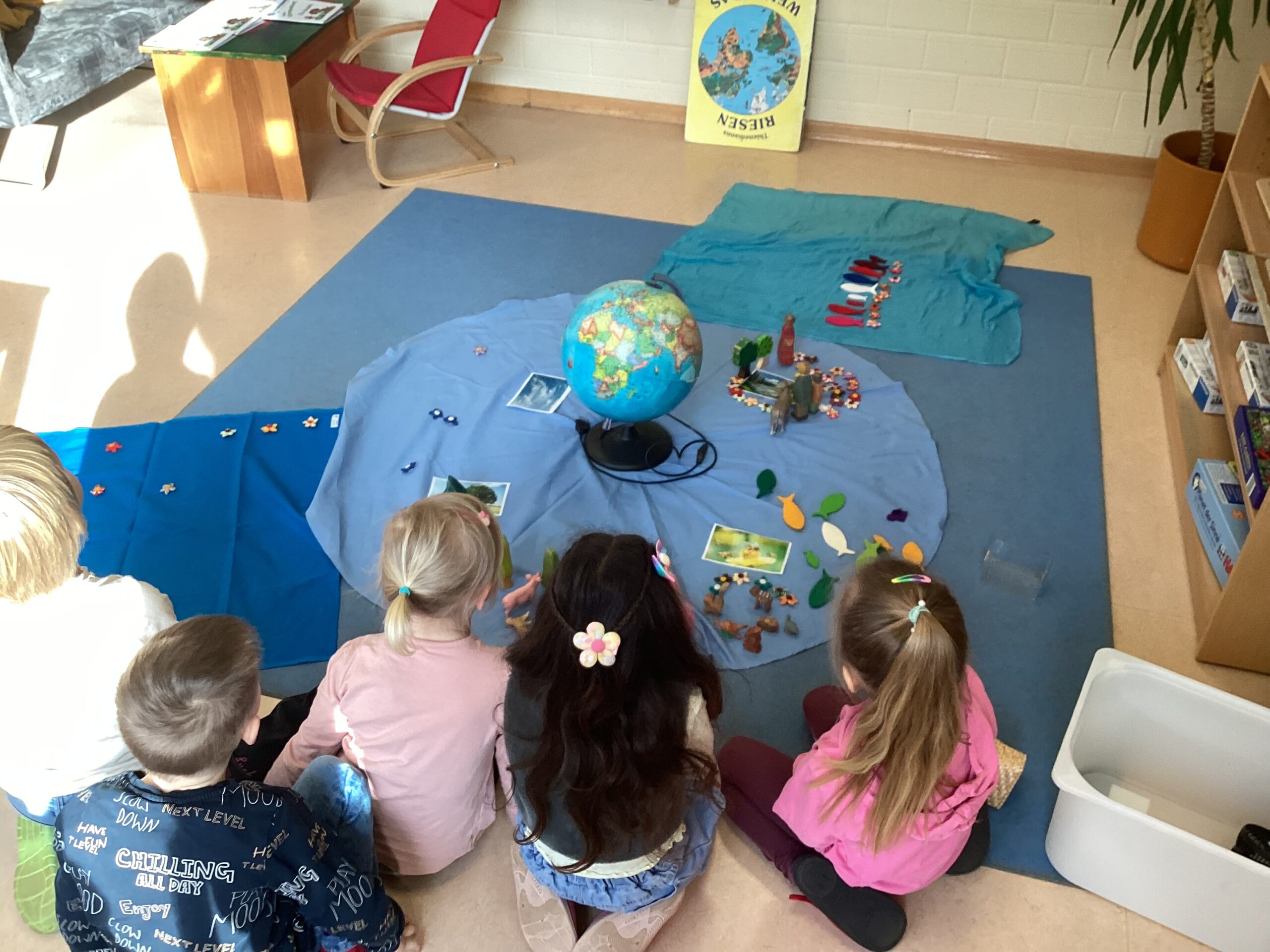 Die Aktivitäten finden gruppenübergreifend im ganzen Kindergarten statt, wodurch dynamische Projektgruppen entstehen und es niemals langweilig wird. Jeden Morgen können die Kinder ein Foto von sich an einer vorbereiteten Flipchart aufhängen, um sich auch visuell in den Themenbereichen wiederzufinden.